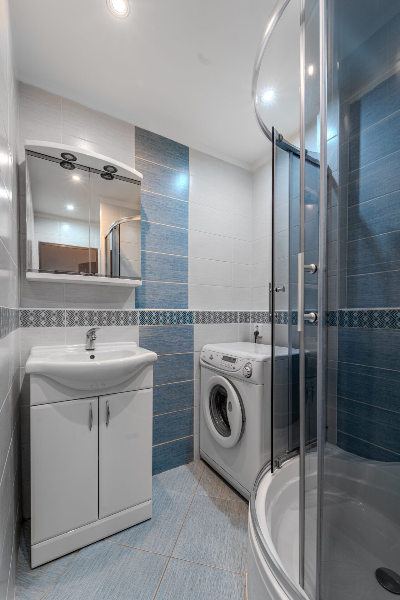 Menší zděná koupelna je vybavena umyvadlovou skříňkou, zrcadlovou skříňkou, sprchovým koutem a pračkou.
