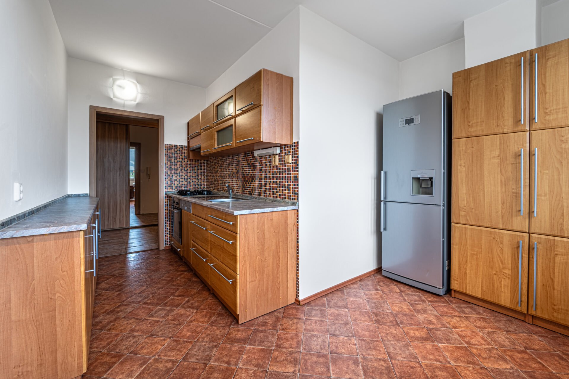 Kuchyně s vestavěnými spotřebiči, zděná koupelna, rozvody elektřiny a plynu v mědi.