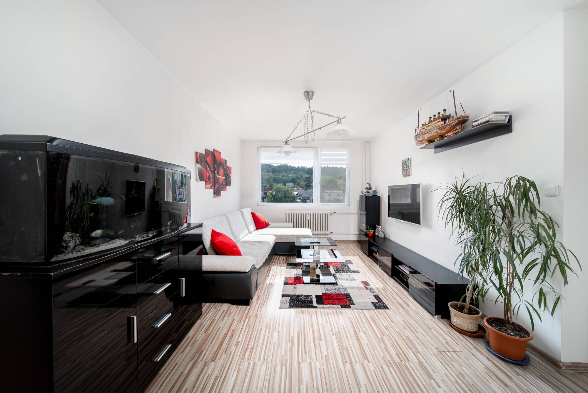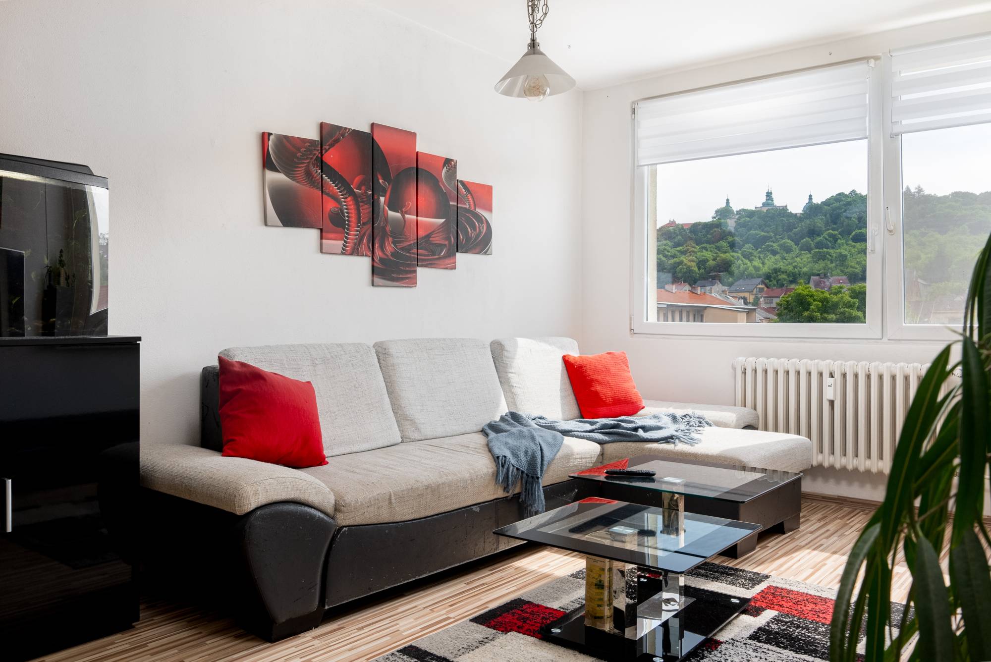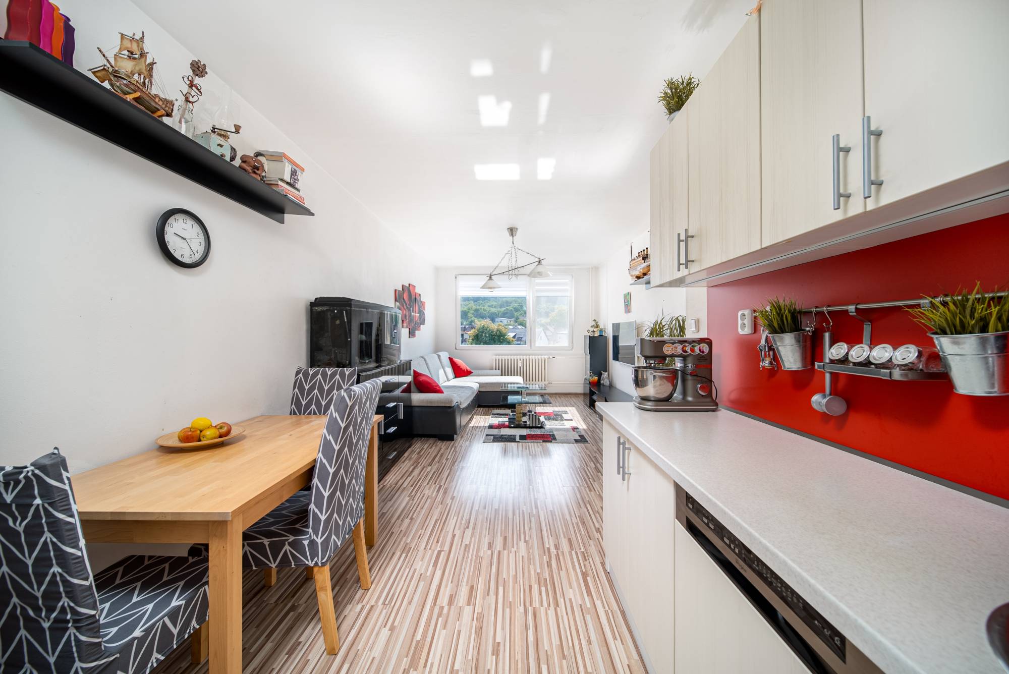 Současné parametry na bydlení splňuje světlá kuchyně propojená s obývacím prostorem a navíc výhledem na chloubu Příbrami, Svatou Horu.
