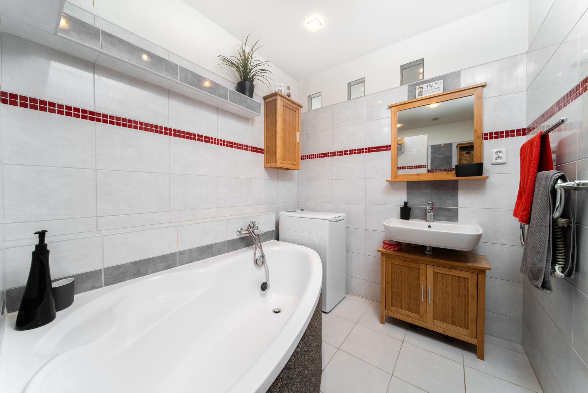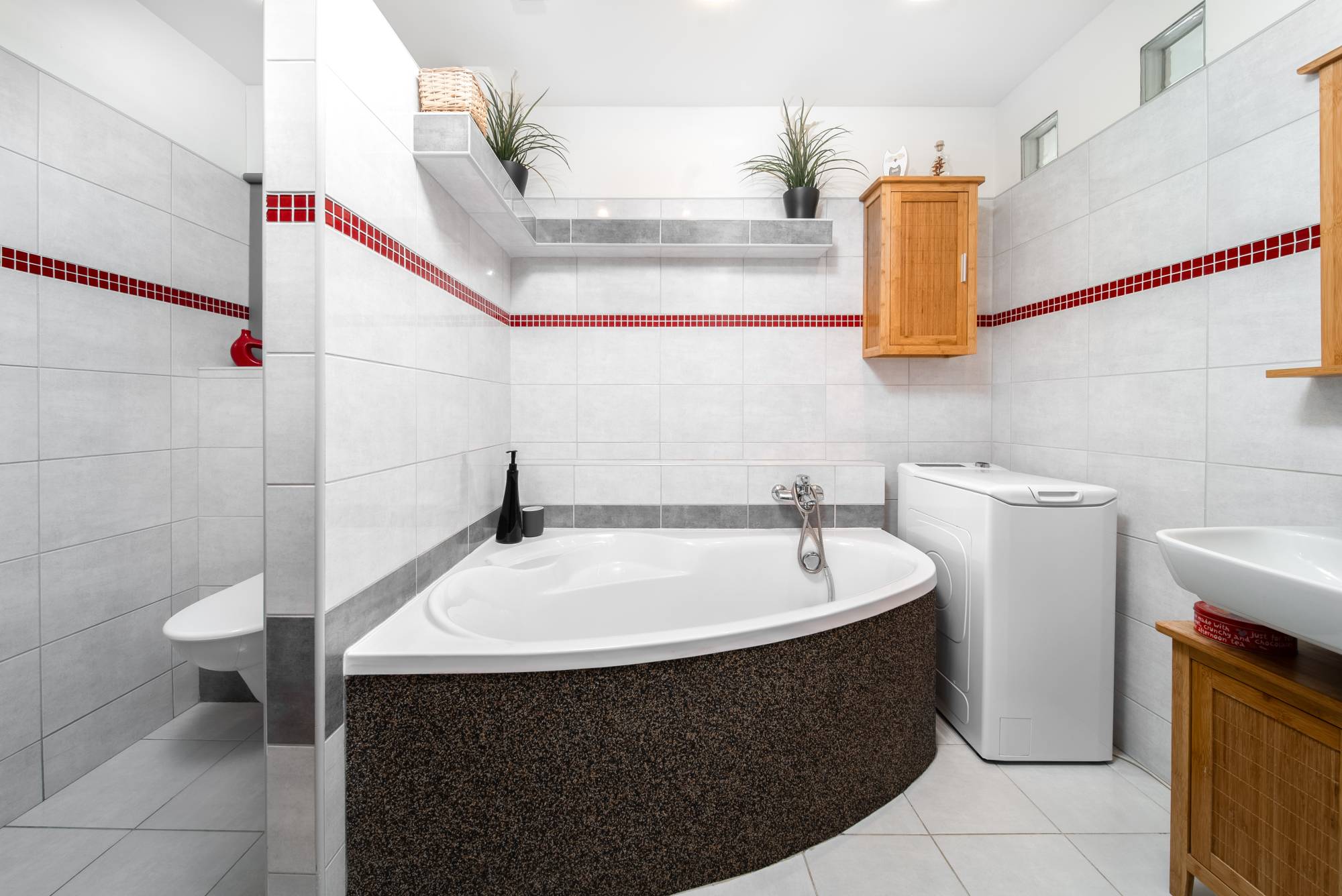 Zděná koupelna s odděleným wc má příjemnou velikost a disponuje rohovou vanou, kde jistě budete rádi odpočívat.