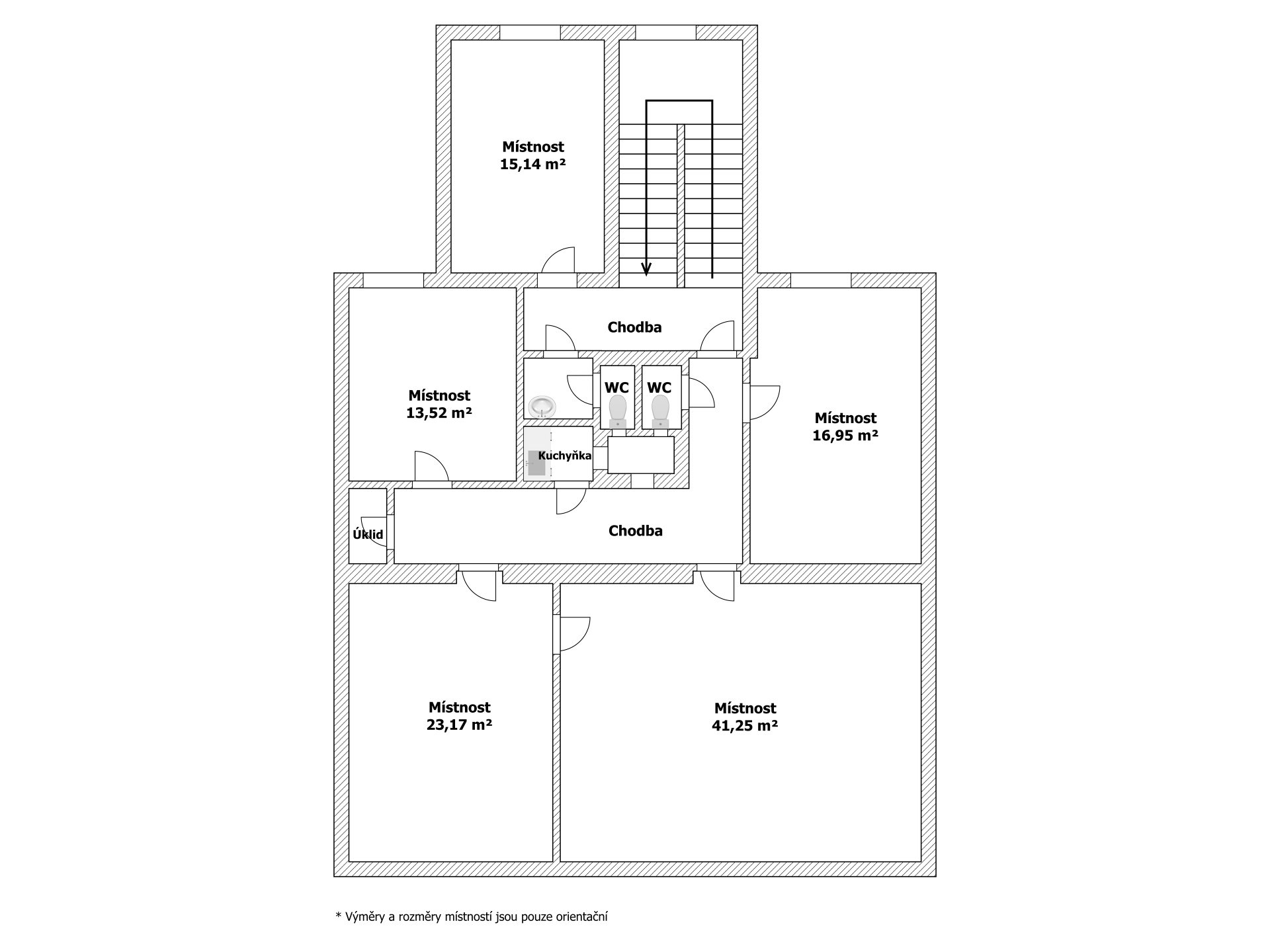Za vstupními dveřmi z hlavní chodby se nachází dvě samostatné místnosti o velikosti 16,95 m2 a 13,52 m2. Dále tu jsou dvě velmi světlé na sebe navazující místnosti, velké 41,25 m2 a 23,17 m2.