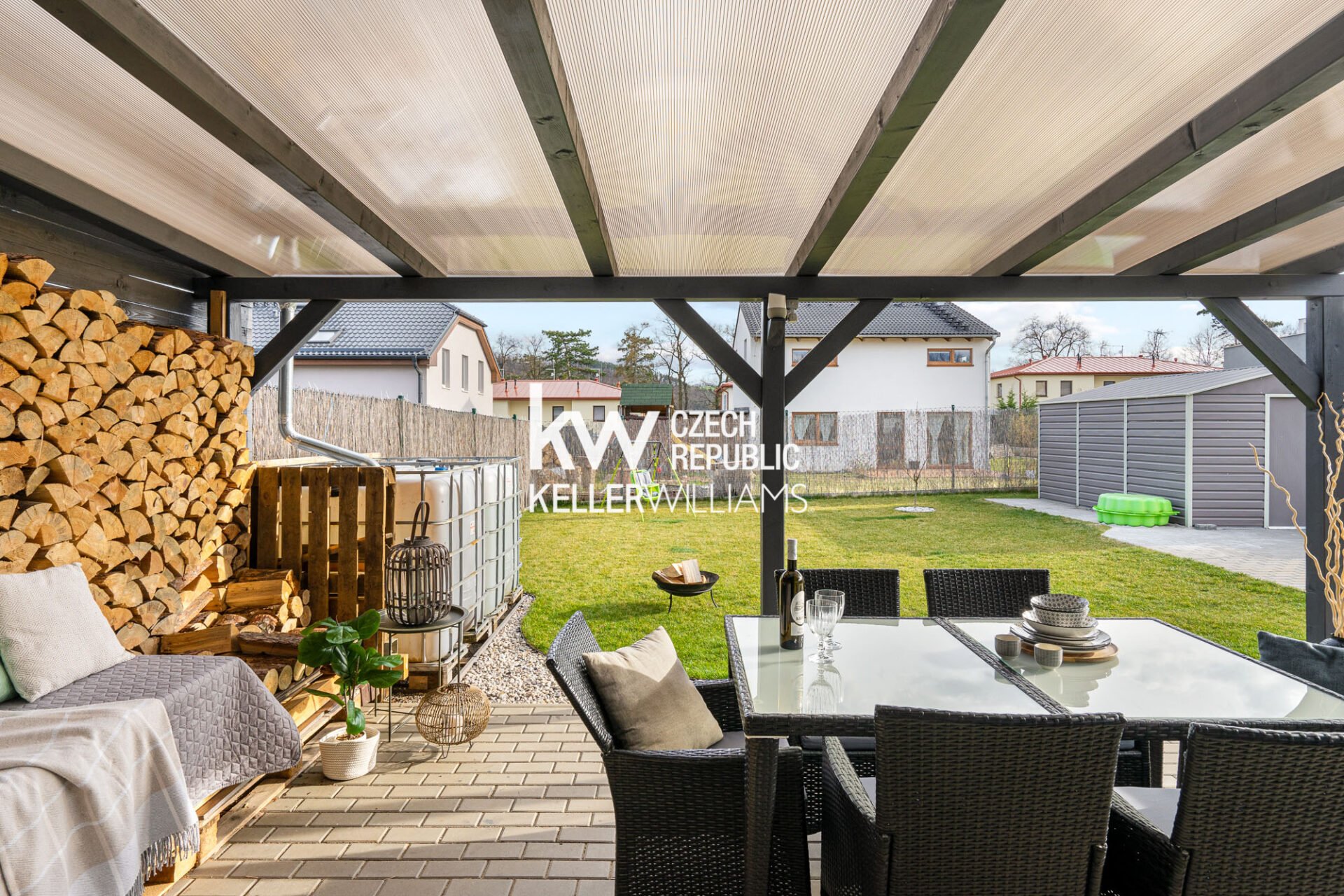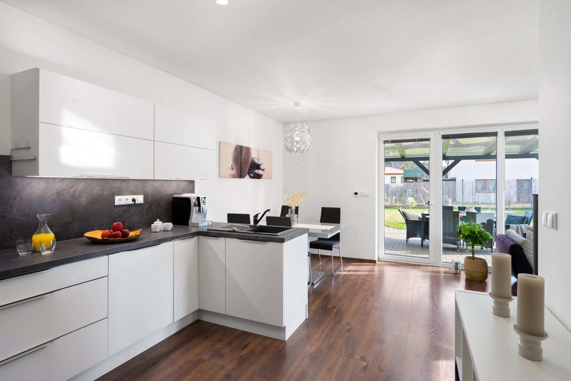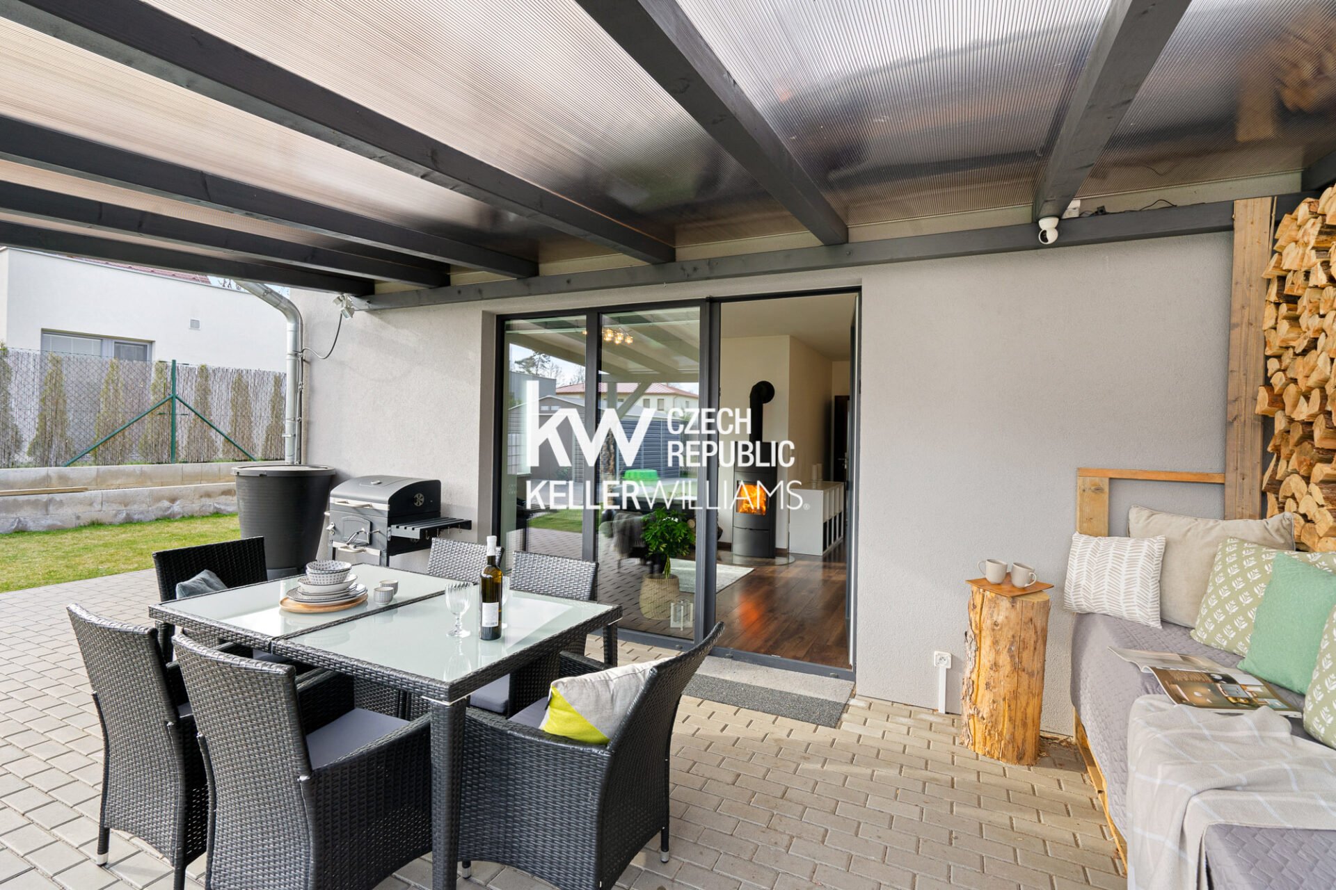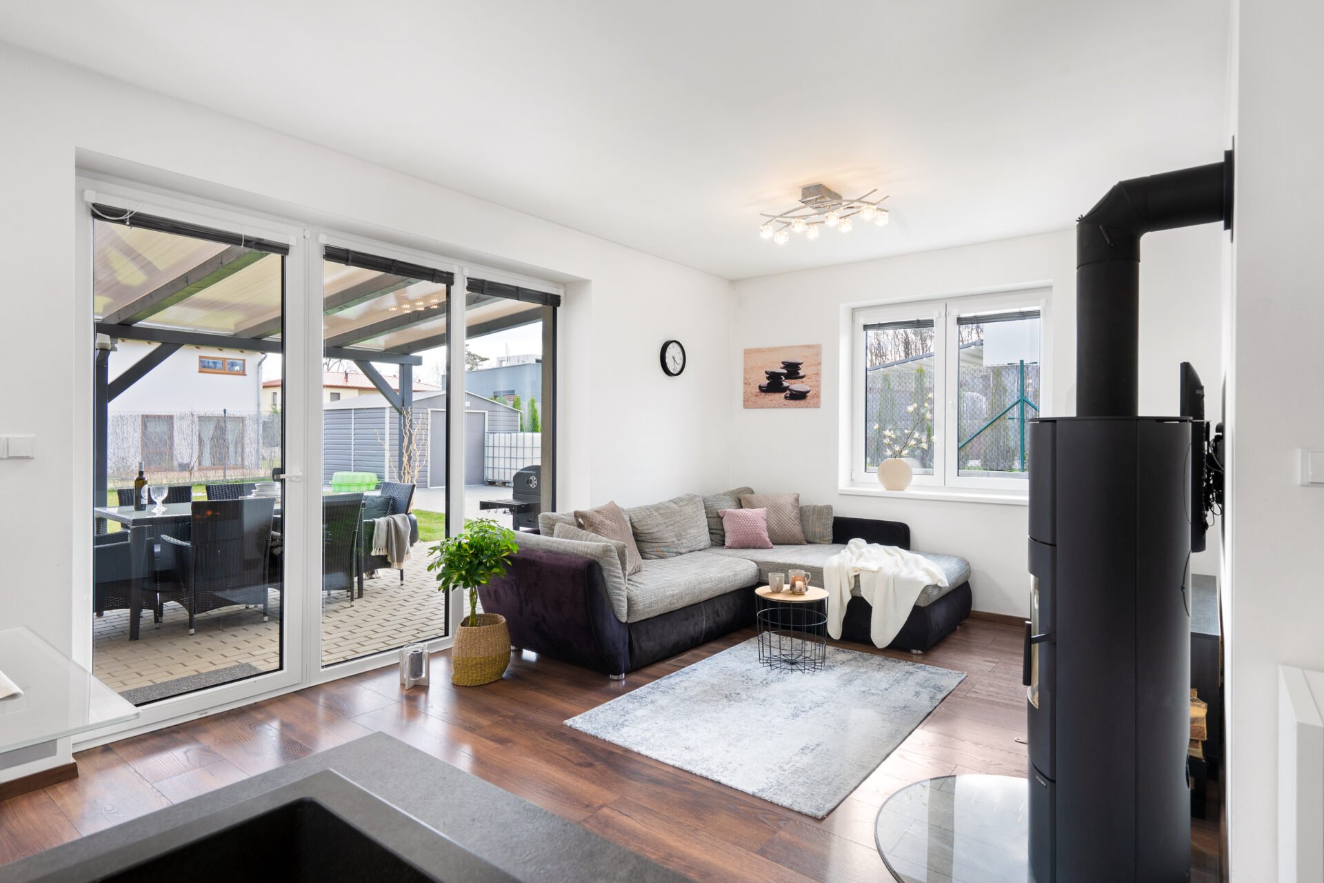 Světlý obývací pokoj s moderní kuchyní jsou orientovány na jih, ložnice na západ a zbývající dva pokoje na sever. Z obývacího pokoje vstoupíte na terasu s pergolou, která má 21 m². V domě se nachází také dvě sociální zázemí (koupelna s wc, vanou a umyvadlem a v druhém se nachází samostatné wc s umyvadlem) a technická místnost.