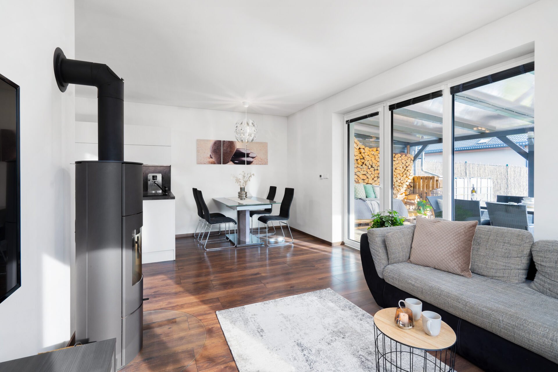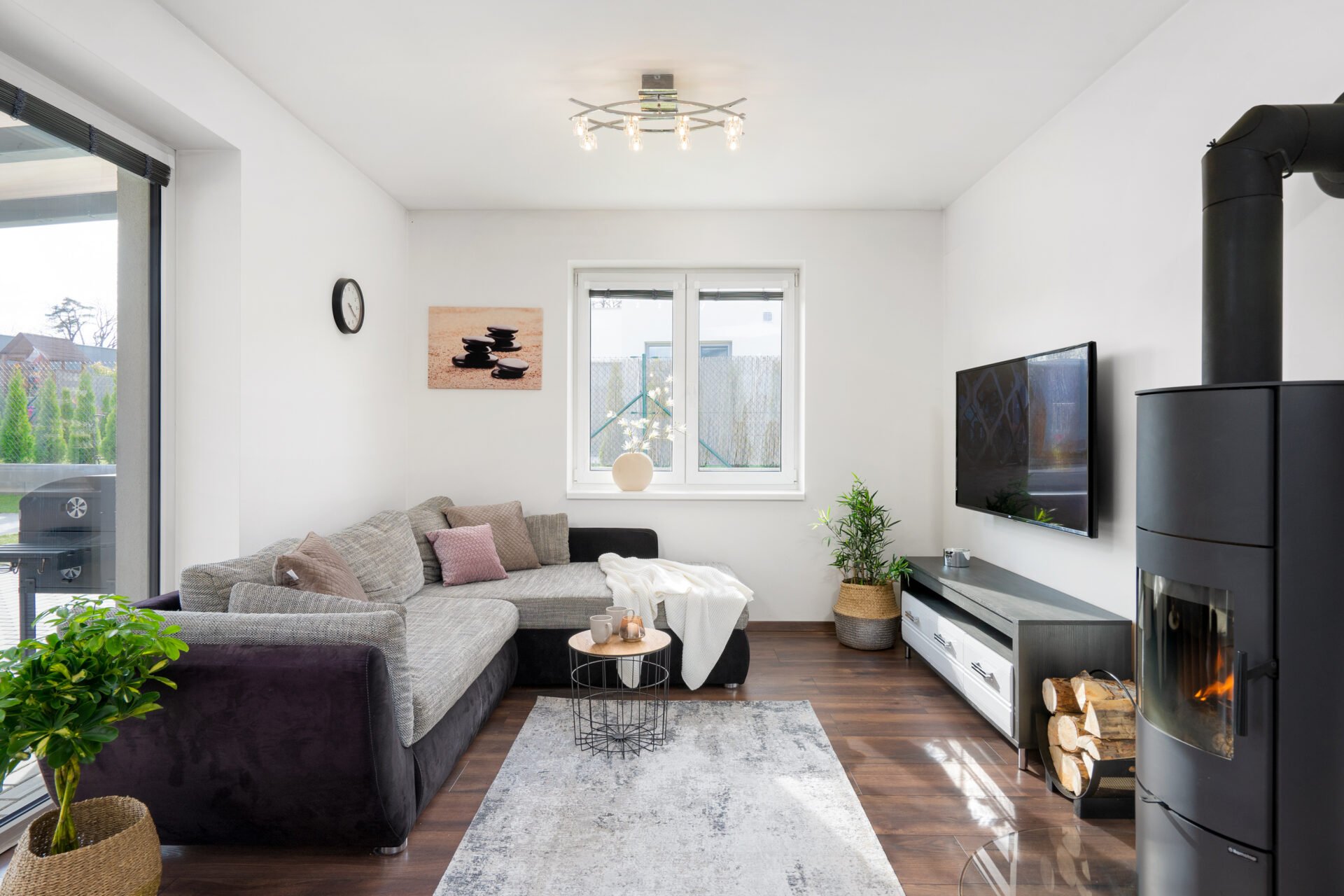 V zimních měsících Vás parádně zahřejí krbová kamna v obývacím pokoji.