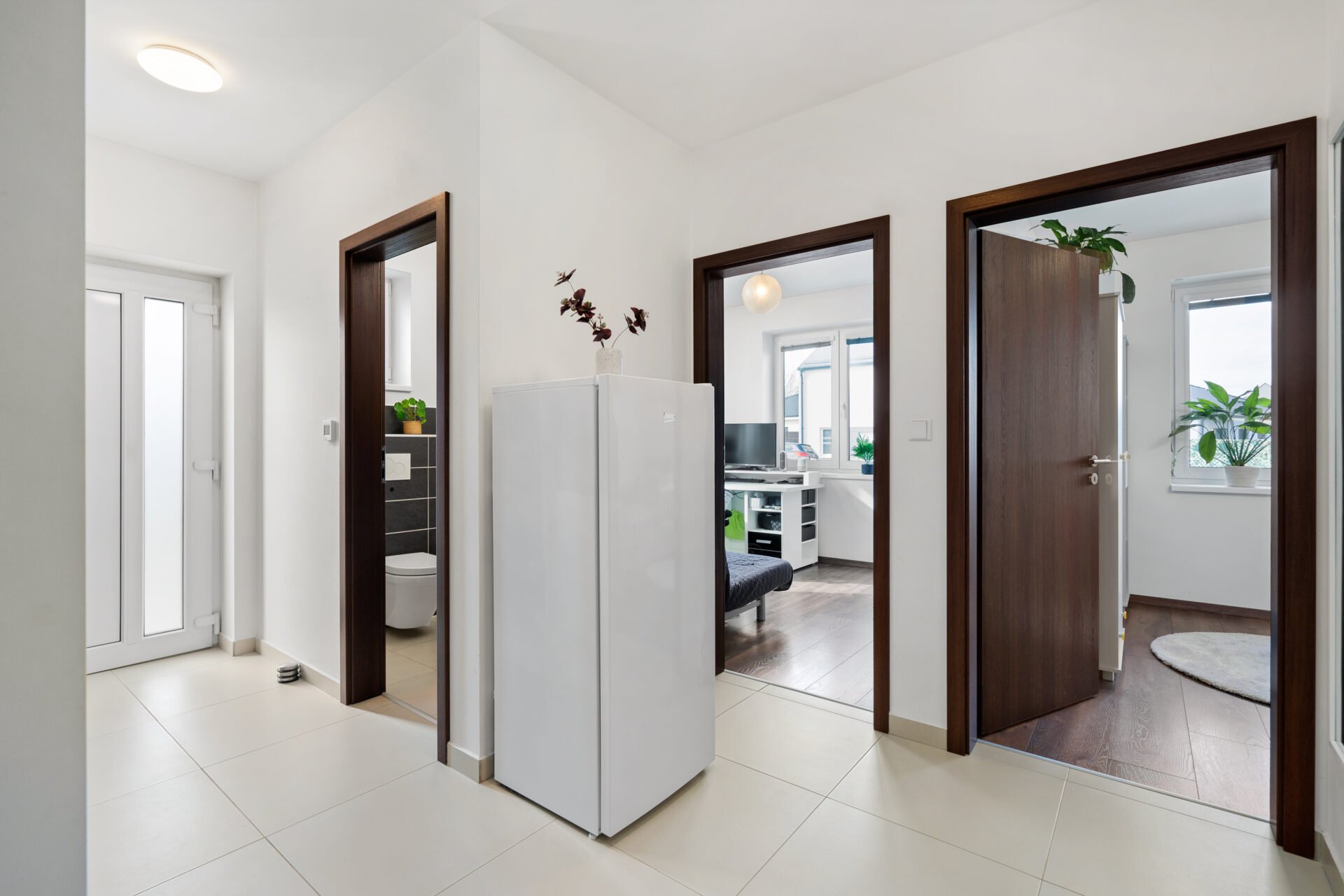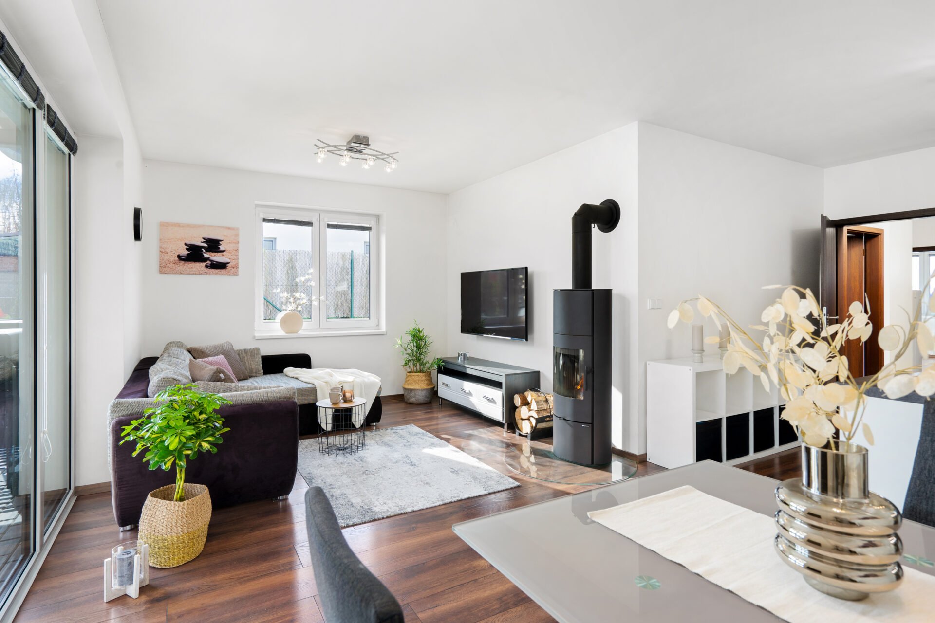 Určitě využijete dostatek úložných prostor, jako jsou vestavěné skříně a velkorysá pochozí půda, kterou lze upravit na další obytnou místnost. Před domem se nachází až 3 parkovací místa. Nemovitost je vytápěna centrálně prostřednictvím elektrického podlahového topení.
